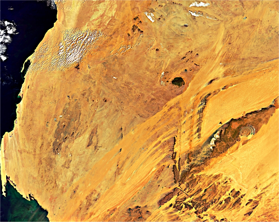 En vedette sur cette image prise par Envisat, deux phénomènes géologiques spectaculaires - « l’Œil de l’Afrique » (à droite) et une montagne magnétique (au centre) - dans le désert du Sahara, en Mauritanie, au nord-ouest de l’Afrique.