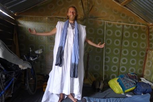 Le lendemain, je m’arrête 80km plus loin pour un nouveau contrôle, là je vais carrément passer l’après midi, la soirée et la nuit avec les militaires. Je mangerai au total 3 repas en un après midi ! Tous bien meilleurs qu’avec mon réchaud (que je n’ai pas encore sorti en Mauritanie) et surtout en bonne compagnie. Il y a même une fête qui est donnée juste à côté du poste, j’y suis invité, l’occasion de sortir mon boubou :